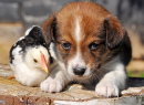 Cão Corgi Feliz Sentado em Dentes-de-Leão