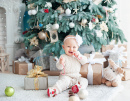 Bebé perto de uma árvore de Natal decorada