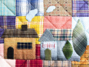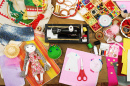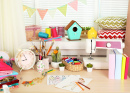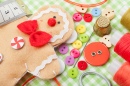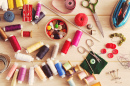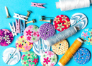 Spools de rosca, botões e pinos de segurança no fundo colorido