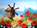 Moinhos de vento holandeses com fileiras de tulipas, Holanda