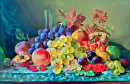 Frutas tropicais coloridas em prato grande. Em fundo de madeira rústico. Vista superior