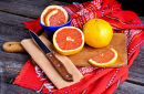 Frutas tropicais coloridas em prato grande. Em fundo de madeira rústico. Vista superior